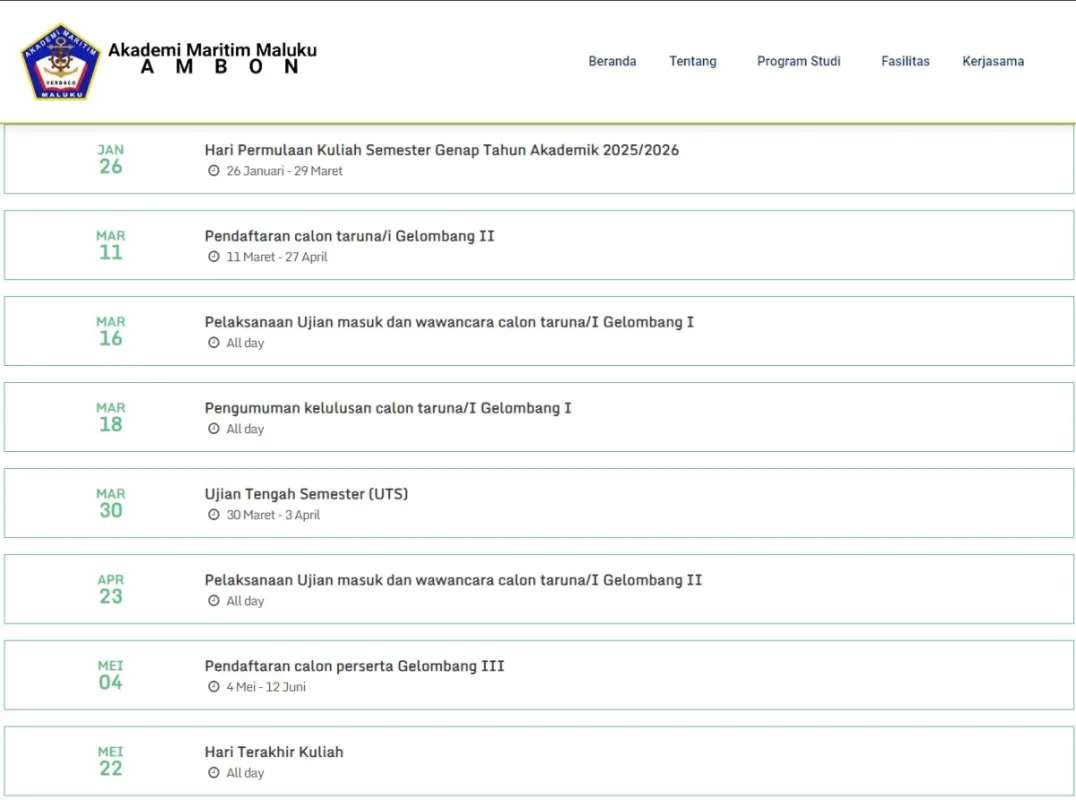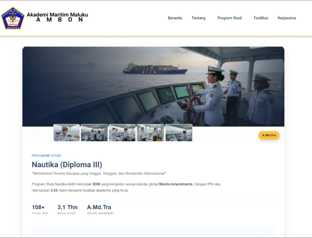 Proyek ini melibatkan pengembangan ulang platform digital Akademi Maritim Maluku (AMM) Ambon untuk menciptakan pusat informasi akademik yang modern dan terintegrasi. Fokus utama pembangunan website ini adalah menyajikan profil institusi yang kredibel, memfasilitasi sistem informasi pendaftaran mahasiswa baru (PMB), serta menyediakan akses cepat ke layanan administrasi kampus. Dengan desain yang responsif dan navigasi yang intuitif, website ini kini menjadi jembatan utama antara civitas akademika, calon taruna, dan instansi maritim nasional.